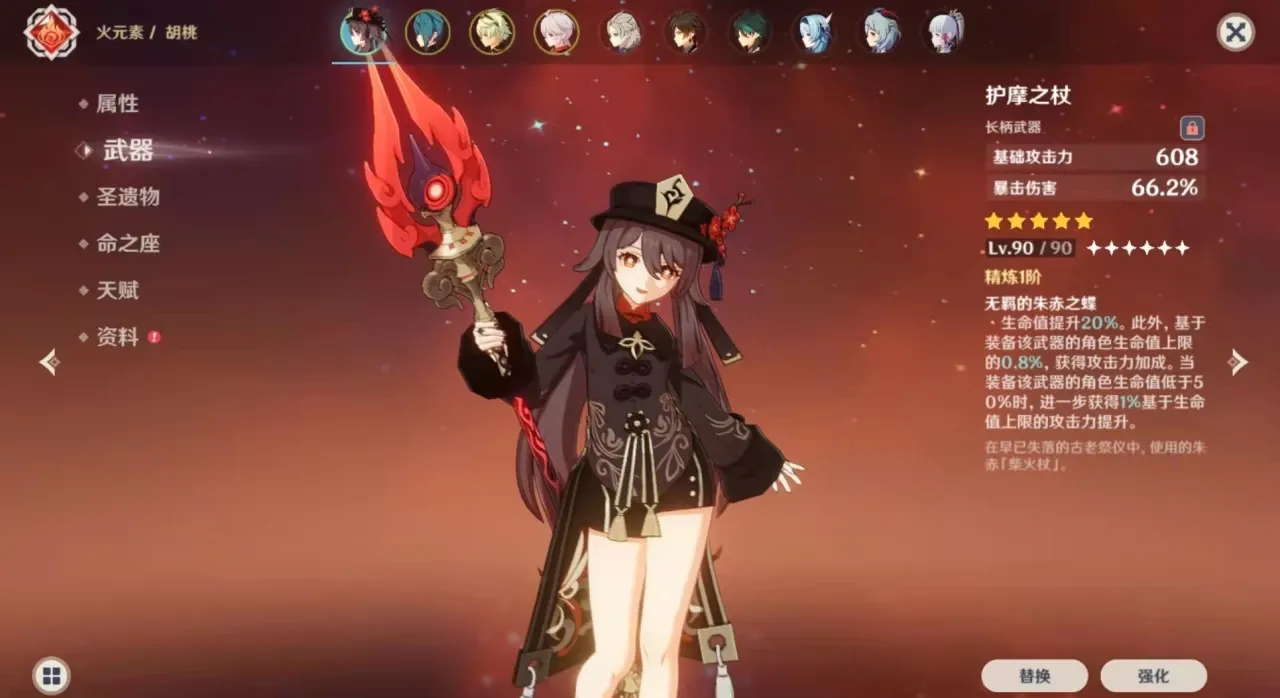胡桃武器首选护摩之杖,下位替代满精匣里灭辰,圣遗物词条选择生命火伤爆伤或暴击,暴击需要堆到60以上,爆伤堆到220左右就可以考虑堆精通了,魔女4件套最佳,也可以追忆4件套,前期可2火2流浪过度。