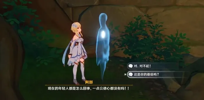 清掉之后就可以看到角落里有一批幽灯蕈了,幽灯蕈就是阿部任务中的蘑菇,这些蘑菇的刷新时间是48个小时。如果来的时候没有采够,只能等到2天之后再进行采集了。采了5个蘑菇之后阿部的幽灵就会出线,阿部会职责我们没有公德心,这里我们直接选择【对不起】进行道歉就可以了。