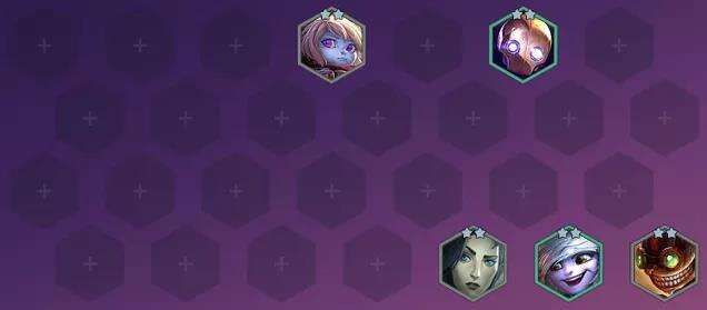 魔法猫咪 悠米(5)、亡灵战神 赛恩(4)【占2格】、蒸汽机器人 布里茨(2)、弗雷尔卓德之心 布隆(4)、风暴之女 迦娜(4)、赏金猎人 厄运小姐(3)、戏命师 烬(4)【阵容主C】