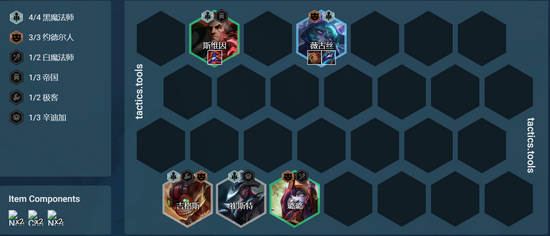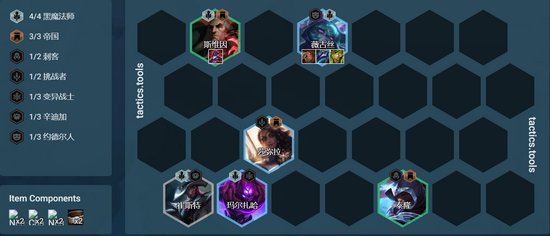 6人口凑出4黑魔法使3帝国羁绊,卡50利息追3星斯维因>3星薇古丝,当然也可以拿一下莎弥拉、泰隆以及马尔扎哈这几张卡牌。特别是莎弥拉这张卡牌是最佳的物理输出英雄,能够完美契合这套阵容所不需要的物理装备。一般只要斯维因追到3星就可以直接拉7人口。