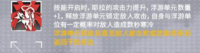 二技能偏复杂一点,在增加一个浮游单位的基础上可以为浮游单位锁定攻击目标,只有在解决掉敌人或者技能结束之后,浮游单位才会回到耶拉身边,同时自身和浮游单位的攻击还有几率给敌人造成数秒的【寒冷】效果。