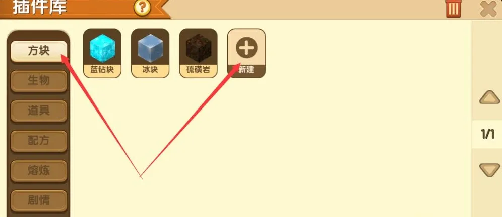 二、在进入插件库的界面之后我们首先选择【方块】选项,一般系统默认就是了,然后小伙伴们可以直接选择图片中所示的【新建】这个选项。