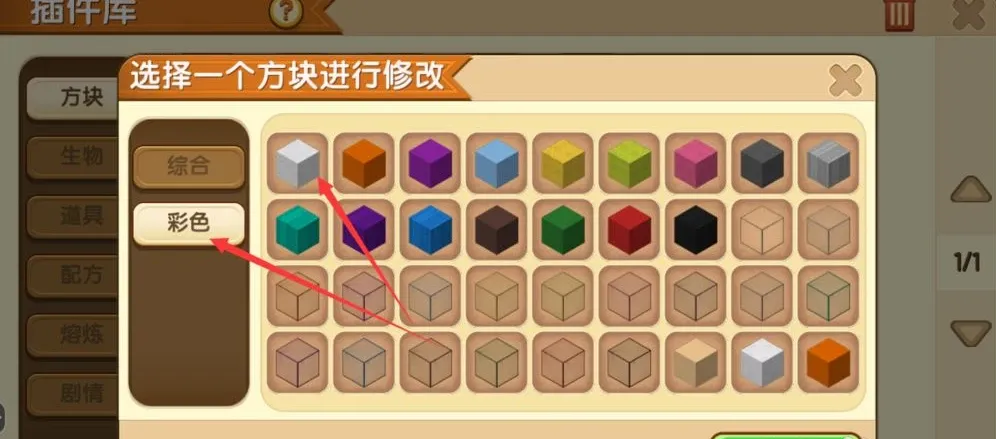 三、点击进入之后会弹出方块皮肤的列表,我们选择第二个选项【彩色】,然后选择一个自己想要改变颜色的方块皮肤,点击【确定】就可以了。