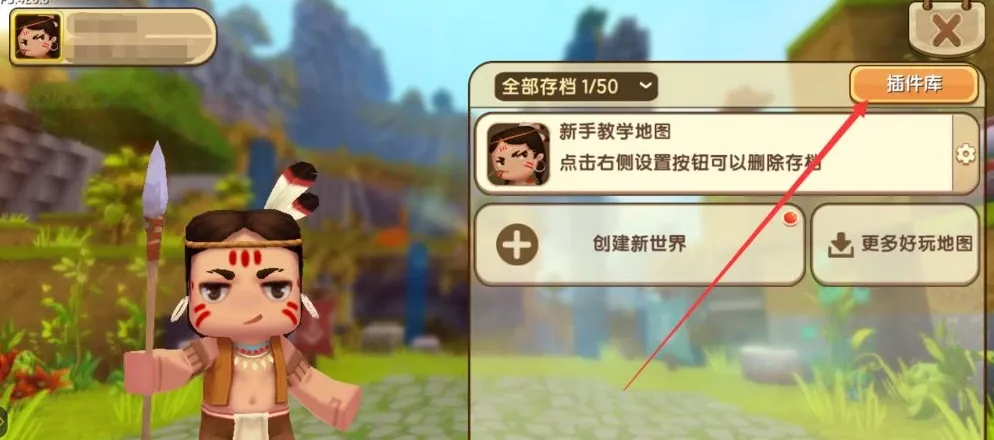一、进入到迷你世界游戏的角色主界面中,然后【开始游戏】,然后选择红色箭头处的在界面右上角的【插件库】。