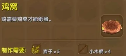 我们先来制作鸡窝。鸡窝需要用到麦子和木棍,然后在工具系统里面把两个材料加进去,点击合成,就可以做成鸡窝了。