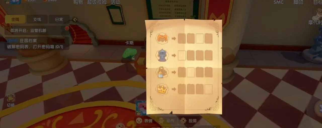 首先这个主线任务主要是调查庄园里面一个宝物失踪的档案,而这个档案被锁在了装宝物的密码箱里面,也就是说小偷不仅偷走了宝物,而且还把档案放在了保险箱里面,嘲讽所有的小摩尔。这谁能忍?这部主线任务就是解开。保险箱的密码,然后获取里面的档案。