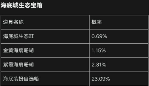 海底城生态缸是通过商队集市中的宝箱抽取,大约花费15R一次,很多玩家抽了很多次也没抽到,可见其概率很低,下面附上海底城生态宝箱中奖概率: