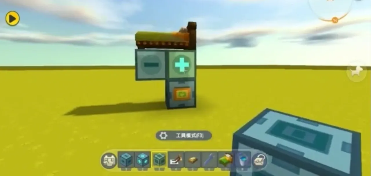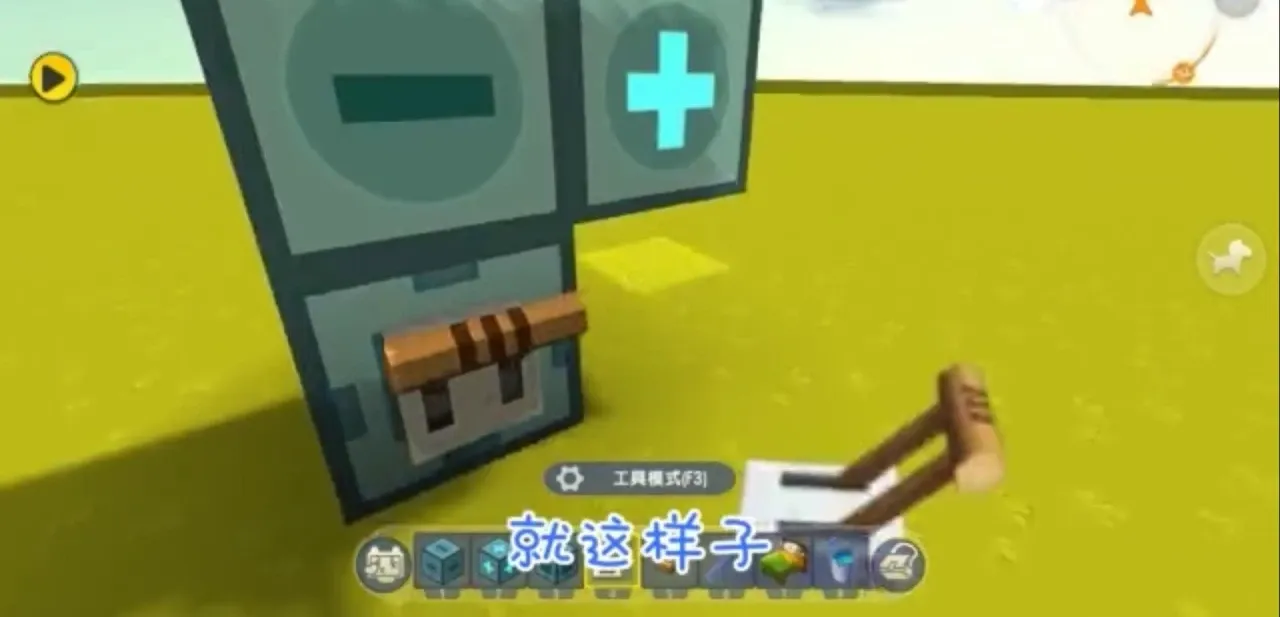 宝宝床的制作方法还是很简单的。首先在家园里面的空地上放一个电子开关,然后在开关上面放一个正号的方块。再在正号方块的旁边(悬空)放一个加号的方块。这样宝宝床的架子就做好了。