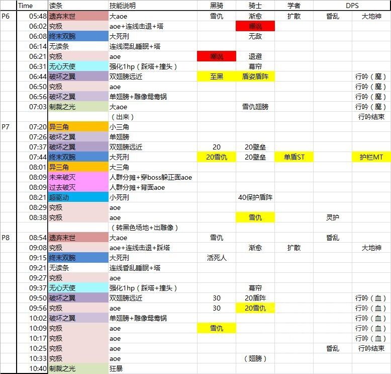 P6:遗弃末世换嘲,这里学者给自己小仙女刷扩散,因为ST要接普攻。开防击退,雪仇究极,读条过半无敌。(这里压力比较大,开荒可以考虑把P5最后的雪仇交在这里,P8同理)无心天使读条幕帘,破坏之翼盾阵脸接,因为铁壁要留给P7的双腕。最后制裁之光雪仇翅膀。