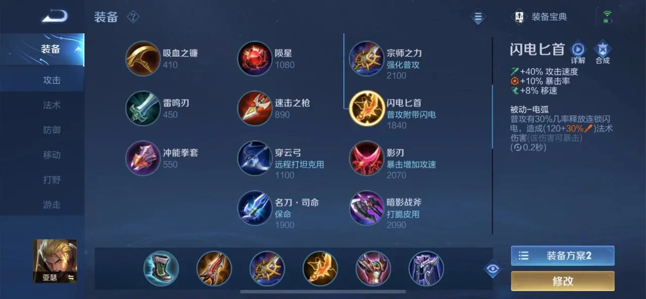 暴击流亚瑟的灵魂就在于出装。首先,鞋子可以出韧性鞋,避免被人风筝。二件装备自然是先出一个无尽战刃,增加高额暴击伤害。第二件的话就是出闪电匕首。增加暴击力及闪电伤害还有攻速。第三件出宗师之力,将能够增加暴击力以及物理输出,还有强化一技能。最后两件的话,出肉装。让他避免被敌人第一时间给消灭。他要空间去输出。