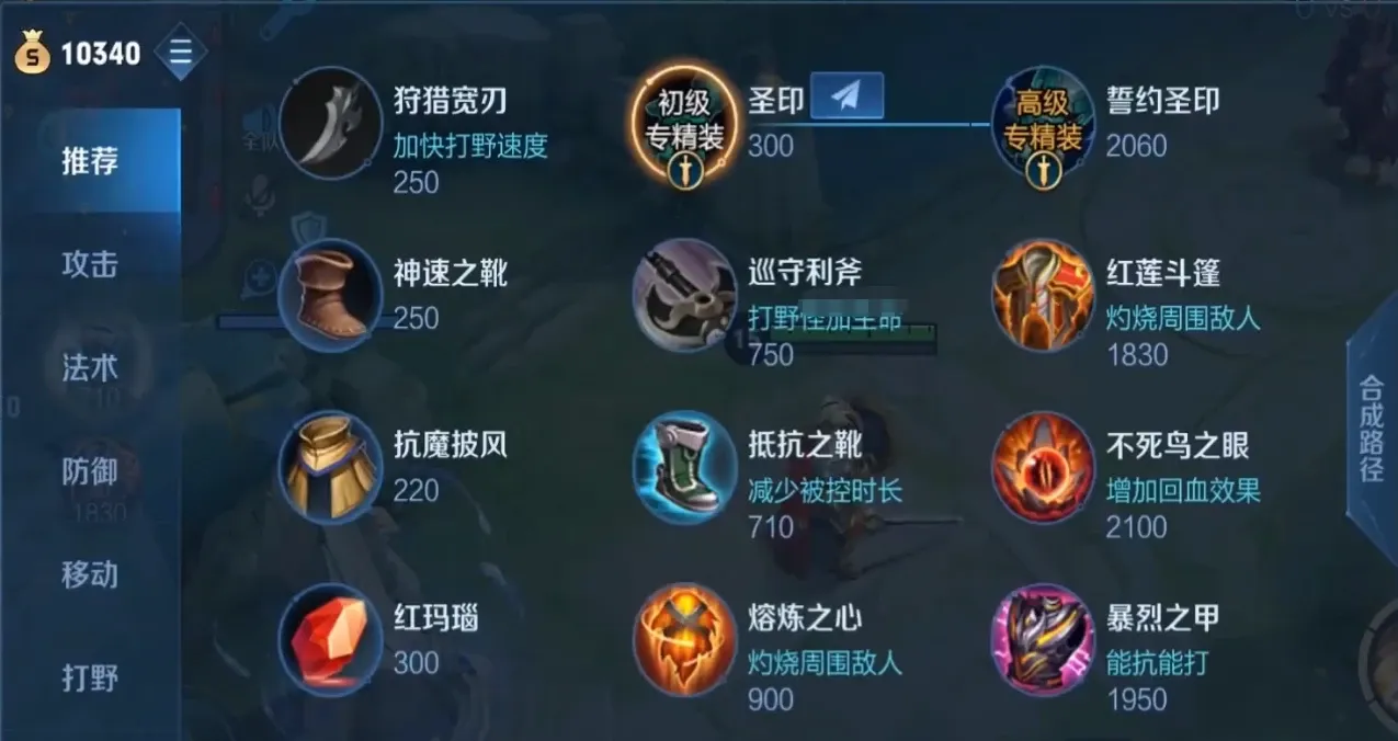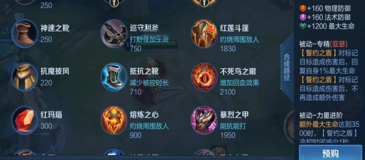 首先来谈谈初级装备的效果,游戏一开始用300金币即可购买。能够获得誓约之盾的专精效果,对标记目标造成伤害后会回复自身的生命值,也就是说提升了它的续航能力。只要他一直粘着敌人跑的话,就不需要担心被人快速的击杀。这时候可以搭配一件不死鸟之眼,就能不断回复自身生命值,堪比程咬金。