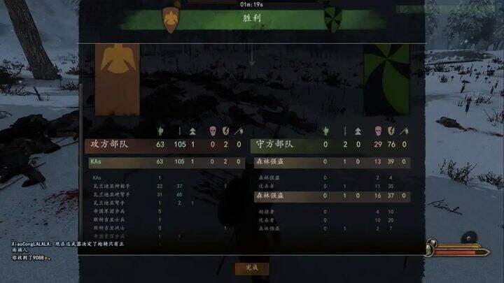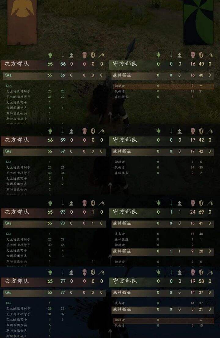 这时候,强盗大军最前面的刚翻过山坡,举盾注意与最前面的保持三步距离,看情况缓步后撤。给瓦弩输出时间。而盾墙状态的步兵,位于两个山坡之间的山坳里,完全不会遮挡瓦弩事业影响输出,可以达到输出最大最优化!