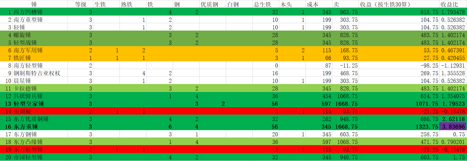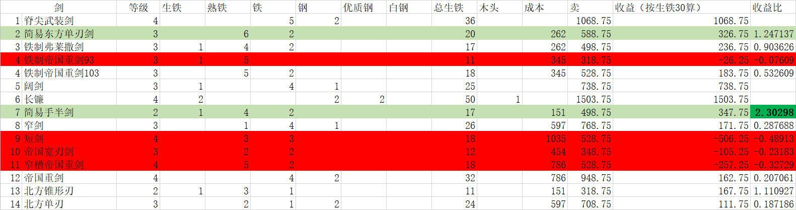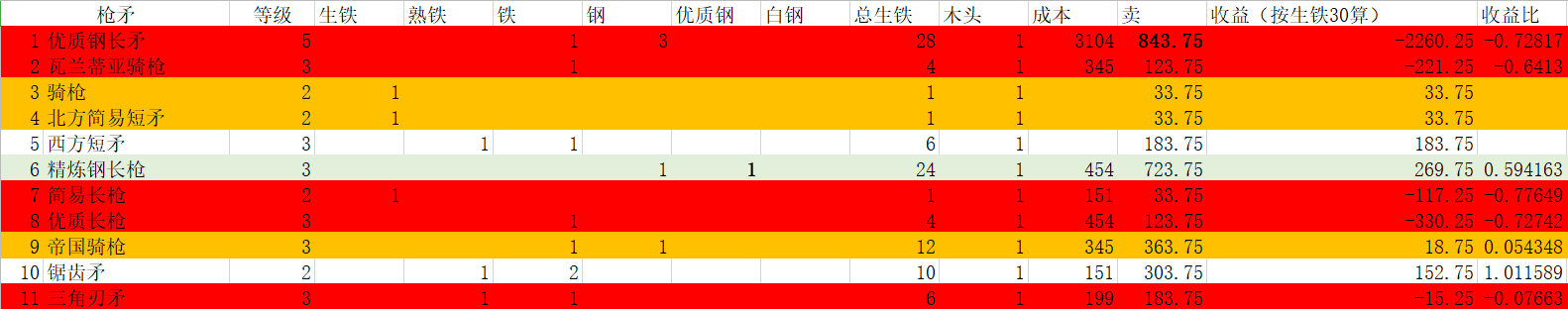 1、枪矛基本都是赔钱货,唯一能赚点钱精炼钢长枪的收益比还很低。