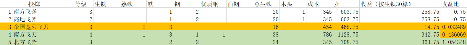 6、投掷类只看了飞斧飞刀,标枪基本都赔钱我就没统计。