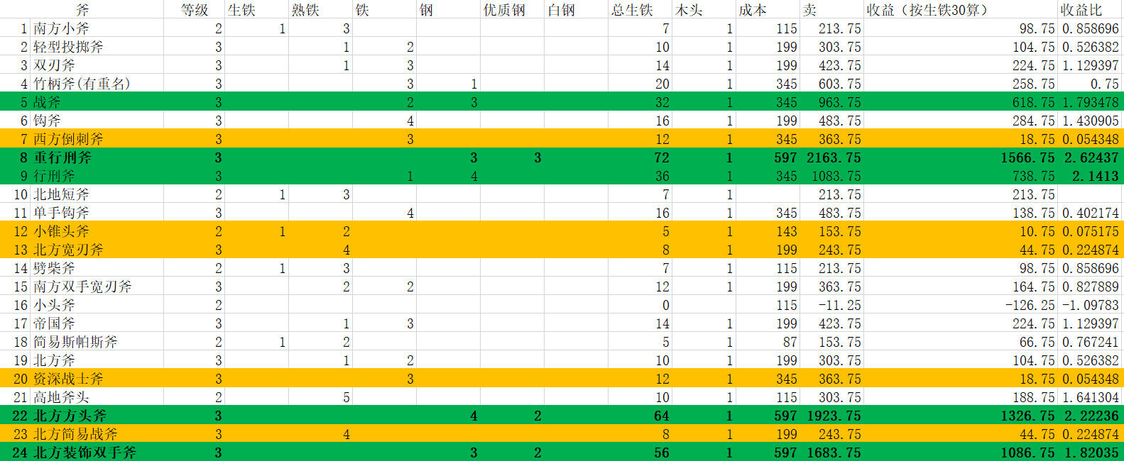 5、斧子赚大钱和不赚钱的都有,重行刑斧是全场单件收益最高的,行刑斧,战斧,北方装饰双手斧,北方方头斧也不错。