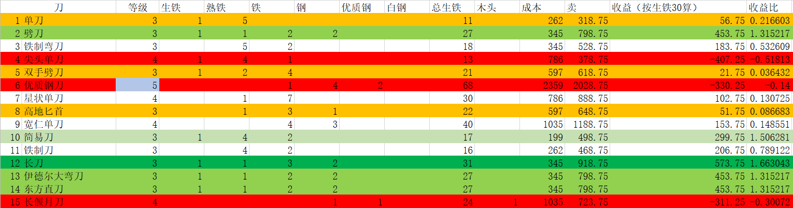 4、刀有赚有赔,长刀,劈刀,伊德尔大弯刀、东方直刀收益都可以。