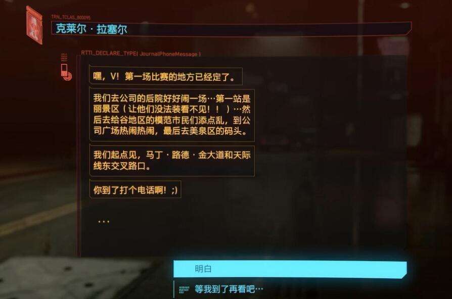 每次比赛之前都需要等一段时间(游戏时间至少一天),克莱尔就会短信通知你比赛的地点。