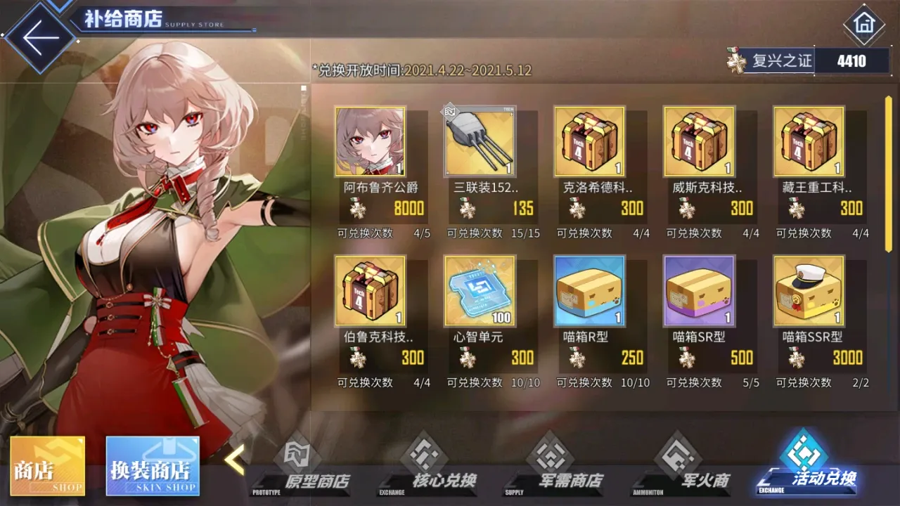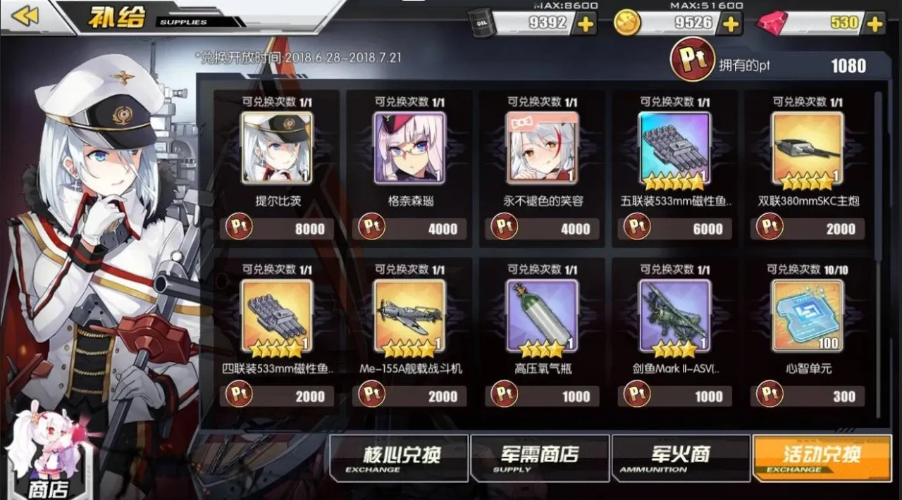 而往往每次的活动商店中都有一艘可以使用8000pt兑换的超稀有舰娘,以及很多这种各样的素材以及装备。由于各个玩家的游戏时间有所差异,建议玩的时间较少,并且没有在活动b-3或者d-3中掉落当期活动商店中的超稀有舰娘的玩家优先兑换舰娘。