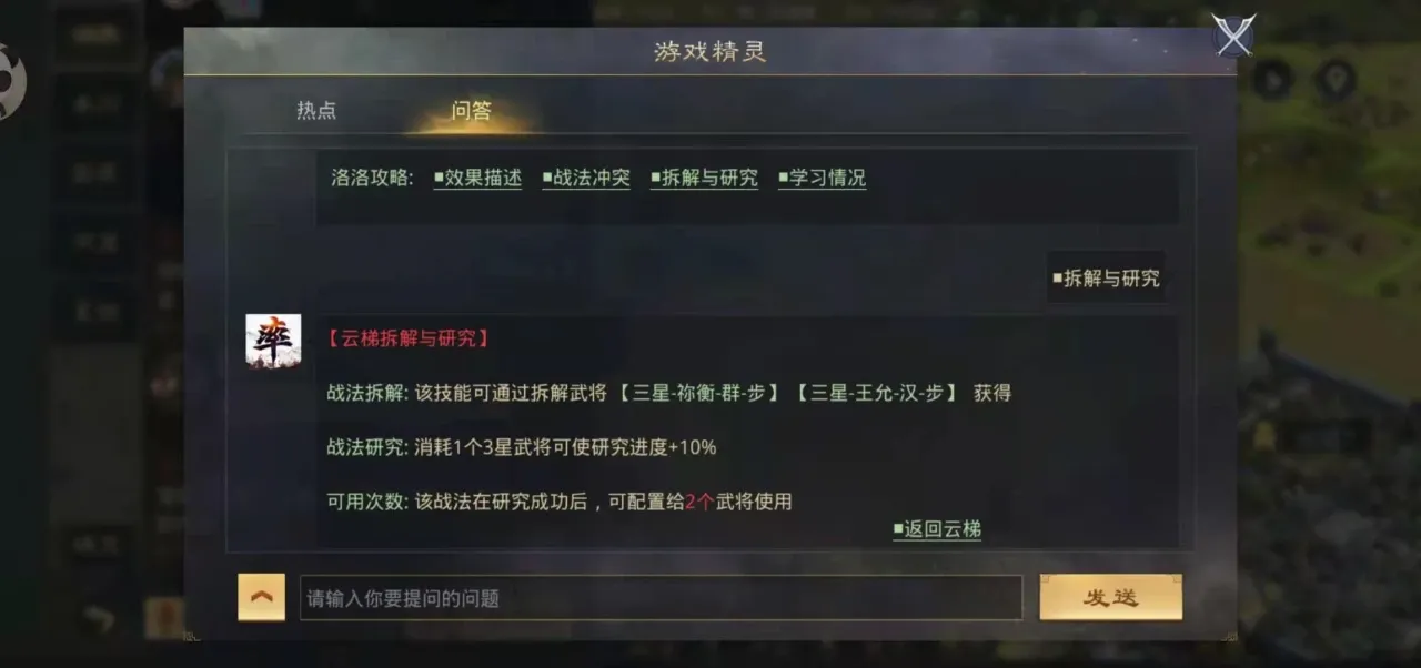 云梯战法拆解是要通过拆解武将三星祢衡和三星王允获得的它的战法研究是消耗一个三星武将,可以使研究进度加10%,该战法在研究成功后,可以给两个武将进行使用,这个战法的获取难度一般来说都是十分简单的。