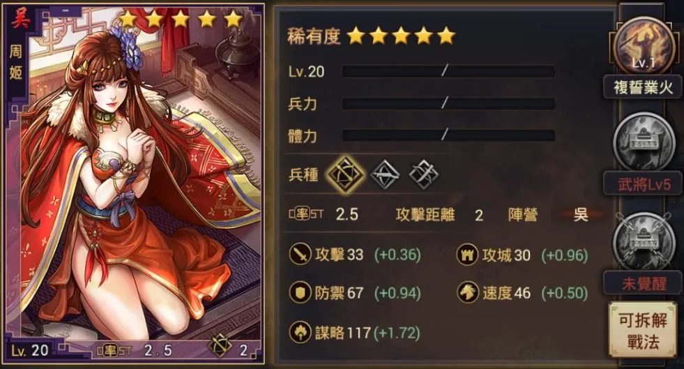 周姬复誓业火战法带有44%的输出加成,相当于神兵天降,战法的发动几率达到45%,带有增伤效果。周姬适合纯谋系的队伍,补充四星武将的攻击力不足,最适合搭配四星陆逊全输出型角色、大都督武将吴弓。