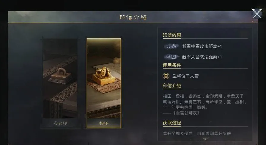 印信系统在爵位系统之后推出,它是权威的代表。印信的作用和效果很多,不仅影响到武将本身,还作用到队伍的其他武将身上。印信属于宝物的一种,武将可以装备宝物或印信。一个印信对应一个部队,它在大营武将装备时发挥效果。印信的作用同宝物不同。