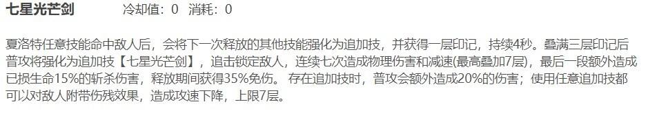夏洛特的技能命中敌人时会获得1层被动效果,叠满3层后下一次普通攻击会变为七星光芒剑,不仅可以给敌方施加减速效果,并且是多段伤害,最后一段伤害具有斩杀效果,是夏洛特击杀敌人的主要手段。
