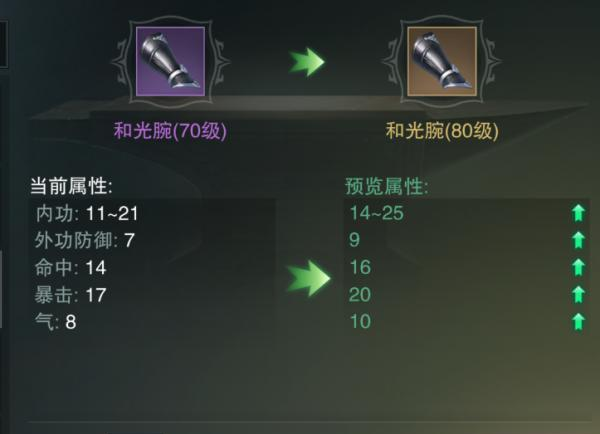 这是一件70级的副本爆的紫色护腕,萌新们不要奇怪我为什么放了一张70紫装。别着急在看一张图,当我们点一下这个装备上的升级按钮就会出现这张图片: