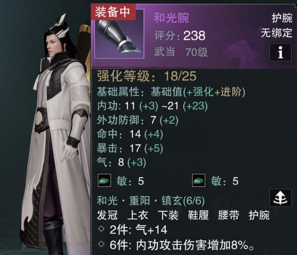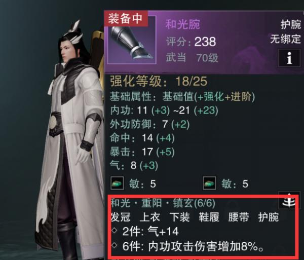 看图中红框,穿齐红框内的6件装备就能激活套装属性:内功伤害增加8%。所以,副本装搭配思路就是按套装需要去凑齐:发冠、上衣、下装、鞋子、腰带和护腕这六件就可以了。
