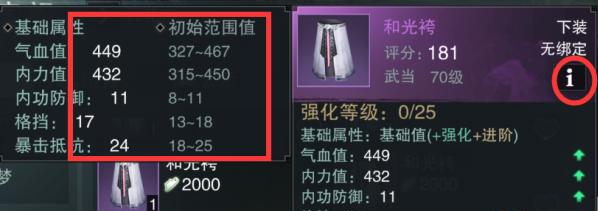 (点叹号就能查看装备的基础值,左边是现在的基础,右边是满基础。集市的装备都要银牌才能买,注意一定要看好等级只有70级的副本装才能升级。)
