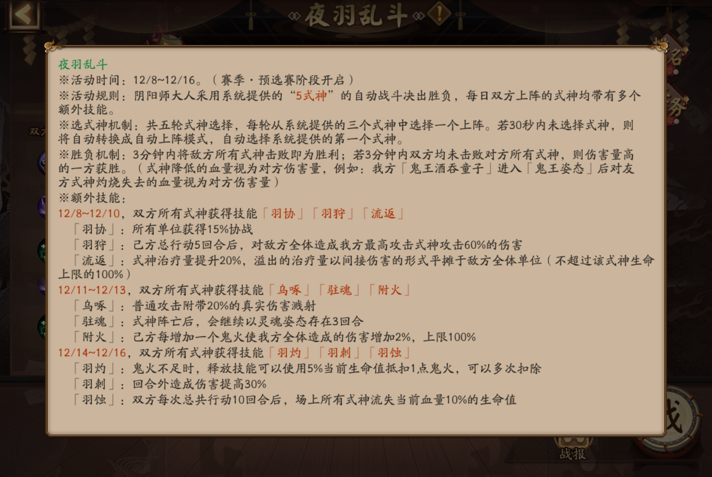 12/14~12/16,双方所有式神获得技能「羽灼」「羽刺」「羽蚀」