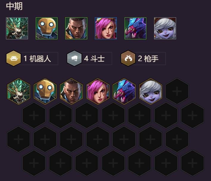 2、中期组合:南天之怒+蒸汽机器人+驱邪圣枪+皮城执法官+虚空遁地兽+麦林火炮