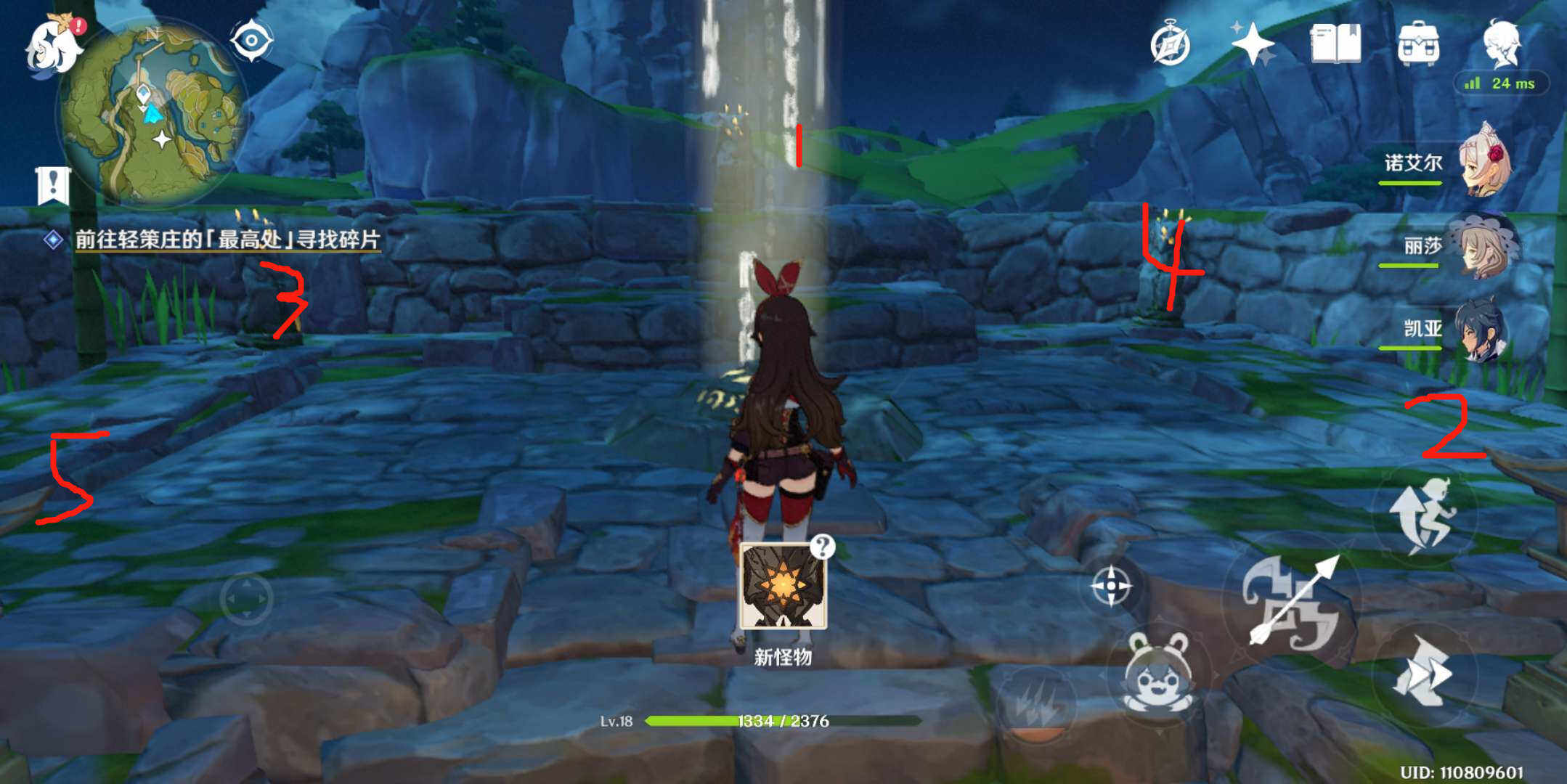 6、接着我们需要传送到碧水园另一个传送点,爬上去可以看到解密雕像,接着依次激活正北→东南→西北→东北→西南方向的石碑。顺序如下:激活之后,可以开启宝箱,得到第二枚碎片。