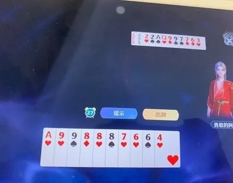 牌面如上图所示,打法是先出三带一,对手紧接着出了一个炸,然后对面会出一个单牌,就走了一个单,又走了一个A,对面紧接着出了个2,又放了对7,这里出了对9,最后就赢了。