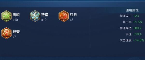 3、第一套铭文:3红月+7异变、10狩猎、10鹰眼