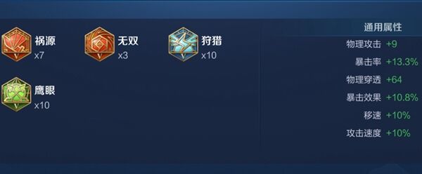 3、第一套铭文:3无双+7祸源、10狩猎、10鹰眼
