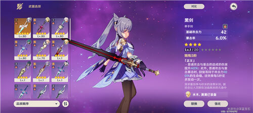 黑剑是大月卡武器,大家如果有兴趣可以换一把,没有也无所谓,这个是提升重击的伤害,主属性还有暴击加成,很契合刻晴。