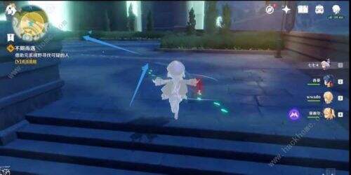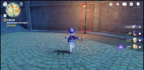 2、到达下图的这个路灯位置会出现派蒙对话,她说脚印消失了,让我们往上爬。