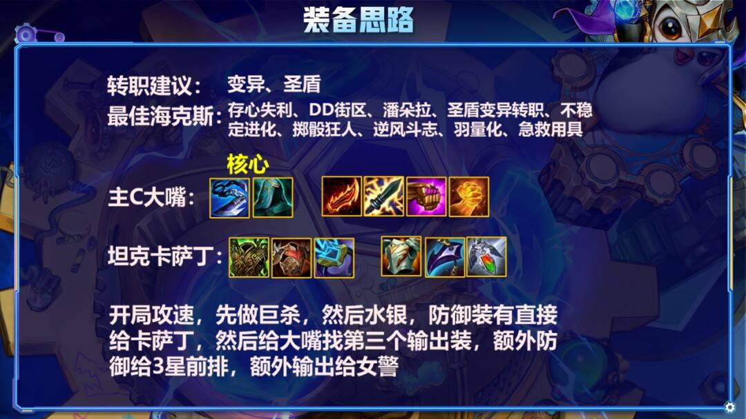 开局攻速,也可以大剑或者拳套,先找大嘴的巨杀,用于克制版本的巨像以及狂徒布隆和赌狗,然后找水银免控,版本控制多,水银免控和沉底极为重要,然后给大嘴找第三件输出即可,电刀羊刀最佳,然后正义帽子法爆都行,期间有前排装备不冲突大嘴装备直接给,卡萨丁不需要完美神装,先保证狂徒反甲冰心之类的防御装,然后找个离子火花克龙牙,如果有电刀就不做离子,减魔抗互相冲突不叠加,多余防御装给盖伦,多余输出给女警即可,阵容重大嘴秒杀能力,而不需要太能抗,版本抗是扛不住的。