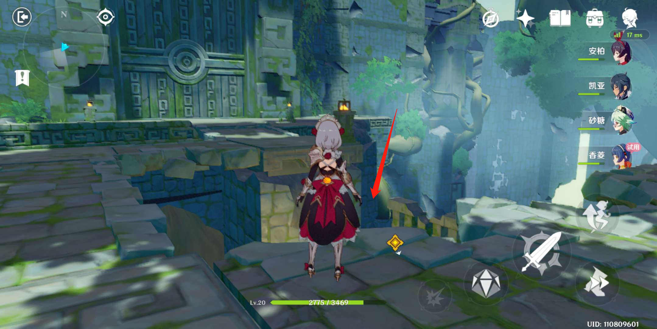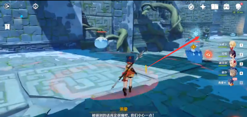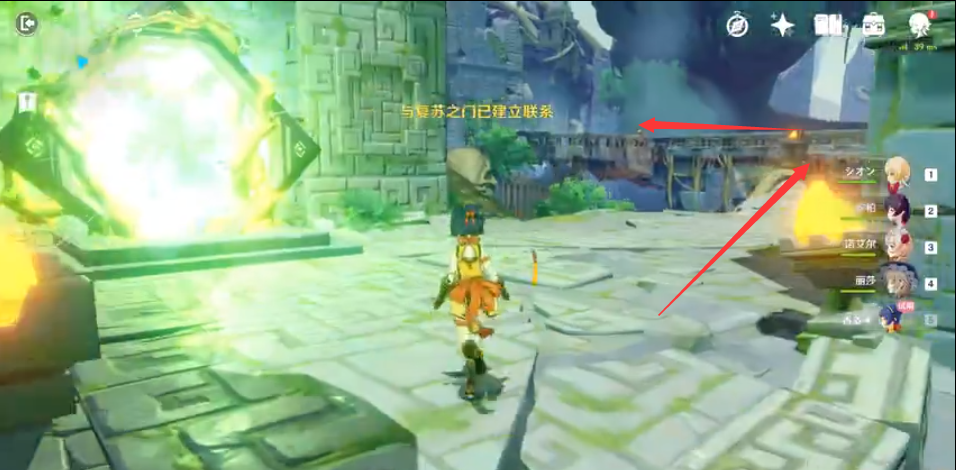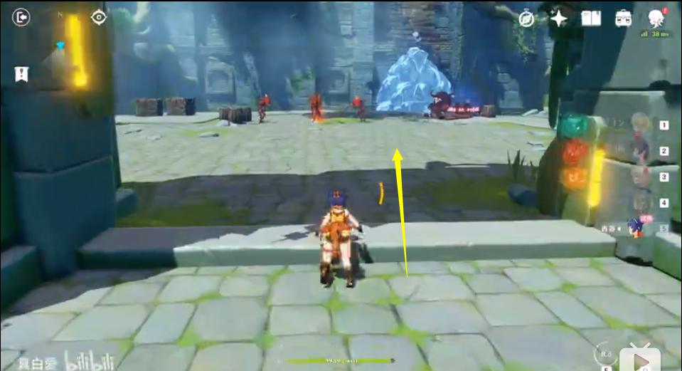 5、走到下图这个地方,箭头指的地方有个元素方碑,用安柏射,然后前面的大门开启了。