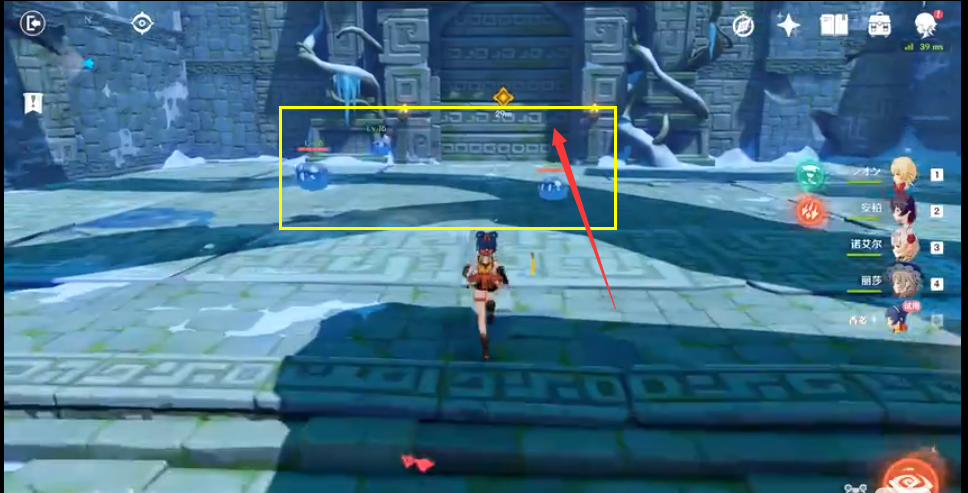 7、清完之后前面的门也打开了,这里的天上会掉冰,可以开诺艾尔防御,前面这波怪打不打无所谓,我们直接顺着光标走。