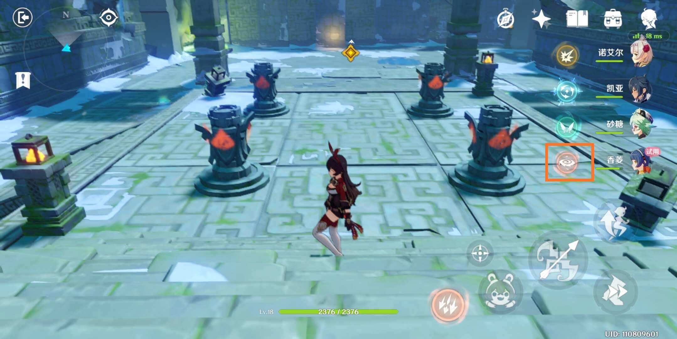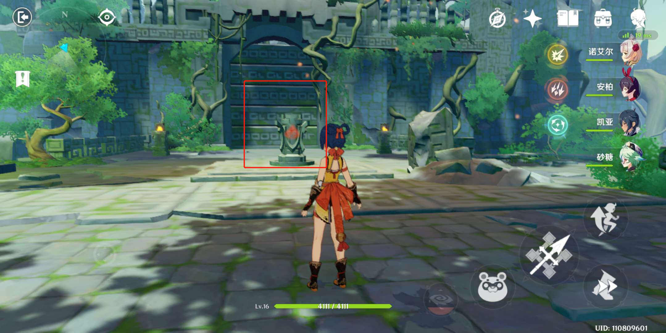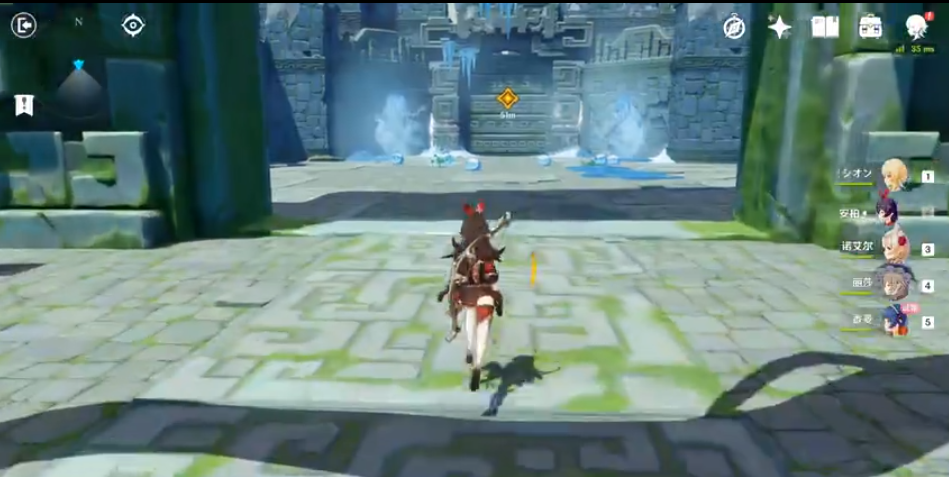 9、进去还有一个门,需要同时激活四个元素方碑,才能开门,香菱站在中间,直接一个大招即可激活,大门开启。(或者香菱扔锅巴,可以激活三个,最后一个安柏用箭射)