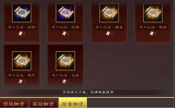 珍奇物资,消耗考工残卷,对应特技书。
