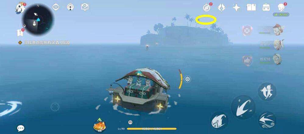 首先打开地图,点击双双岛的传送锚点,并追踪;然后我们看着小地图,往锚点方向走;到达目的地之后,长按起飞建下船,就可以在山的最高点找到装置。