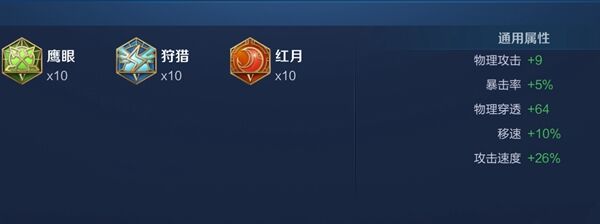 第二套铭文:9红月+1祸源、6狩猎+4夺萃、10鹰眼。