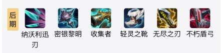1、出装顺序:不朽盾弓+攻速鞋子+纳沃利迅刃+秘银黎明+收集者+无尽之刃