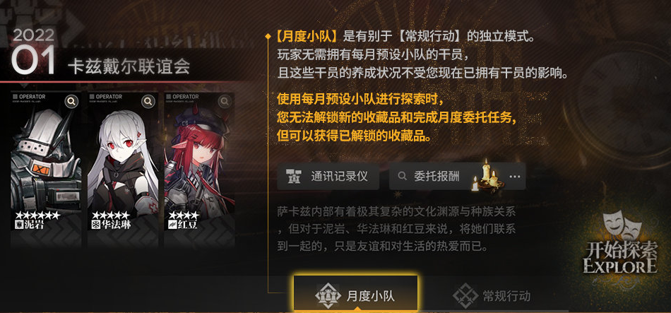 1.【月度小队】是有别于【常规行动】的独立模式,使用每月预设小队开始探索,在游玩途中将会解锁小队通讯记录。使用每月预设小队进行探索时,您无法解锁新的收藏品和完成月度委托任务,但可以获得已解锁的收藏品。