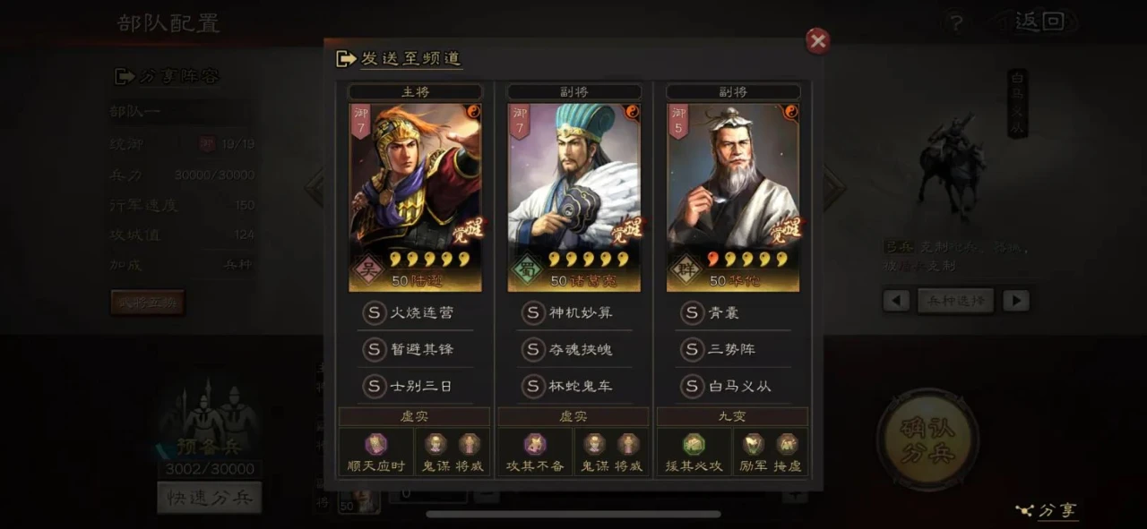 白马自从提供给全队2轮先攻,还有主动技能10%发动几率,行军速度+50%就成了跑得最快的队伍。想要骑兵营赶上它的速度,要到了后期骑兵营满级才行。通过以往的赛季来看,这支队伍可以说是开荒好手了。用陆逊,华佗,和张春华,或者李典代替诸葛亮,等19御再把诸葛亮练兵到20级换上场,开荒属于t0队伍。