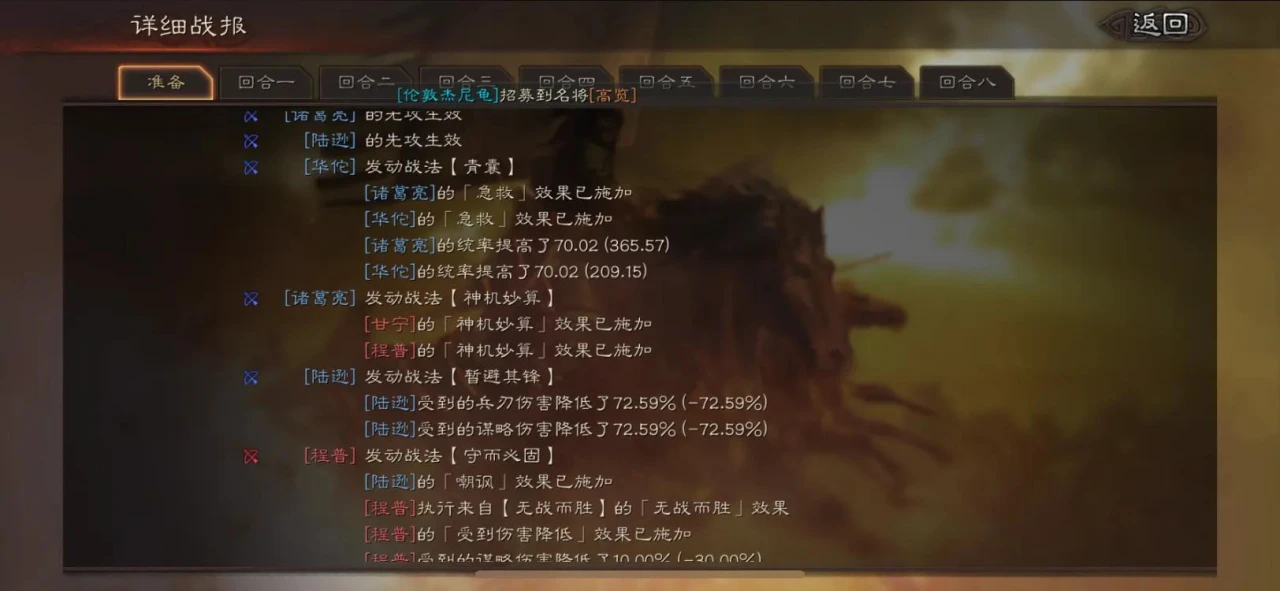 士别三日每次战役大约有一次躲避,以及第四轮全体法术攻击。小编最近抽换到诸葛亮的三技能杯蛇鬼车,相较于之前的风助火势,它能大大地提升全队。攻受平衡的技能,相当于陆逊的主技能。火烧连营,则是全队的核心输出技能,正常战斗上万、1.5万,2万也是属于日常操作。
