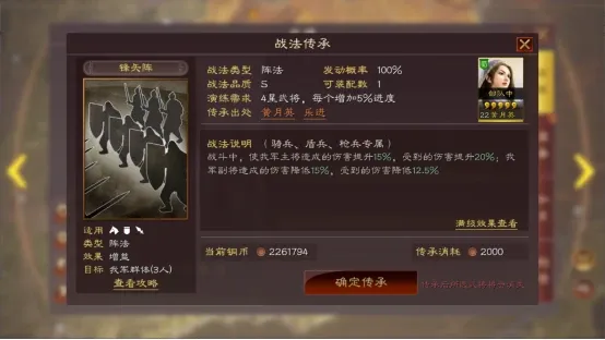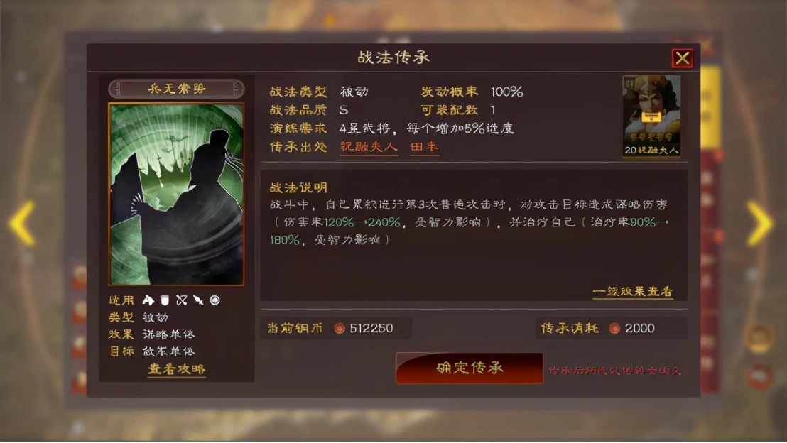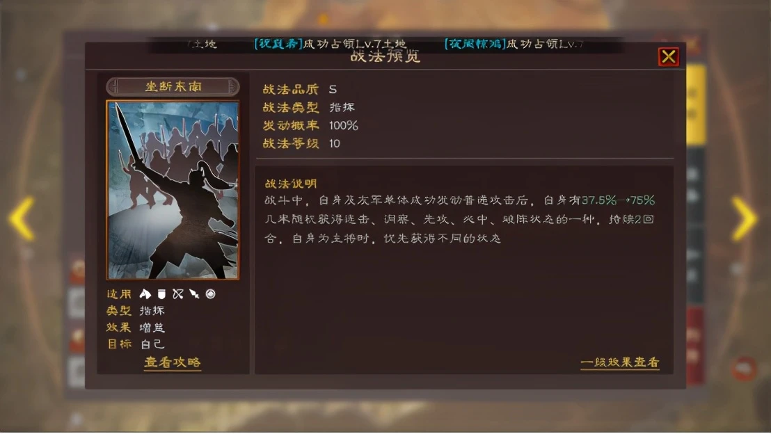 最终是替换太史慈的程普,给其带锋矢阵和折冲御侮来极限孙权的输出,加点选择全统,兵法选择无战而胜、刚柔和防备。