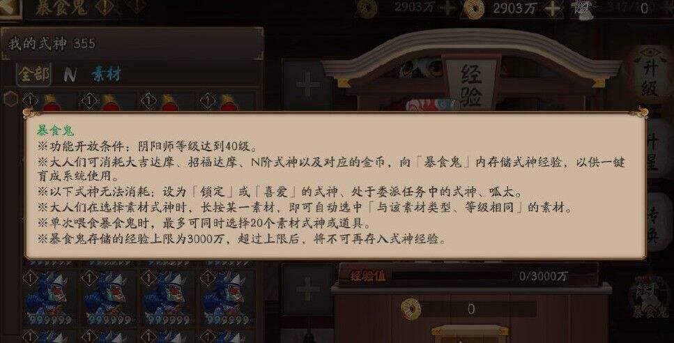 2.大人们可消耗大吉达摩、招福达摩、N阶式神以及对应的金币,向「 暴食鬼」内存储式神经验,以供一键育成系统使用。